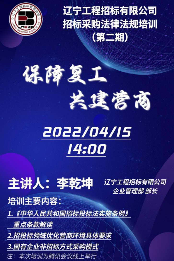 為全面貫徹中國共產(chǎn)黨遼寧省第十三次代表大會和省紀(jì)委監(jiān)委關(guān)于優(yōu)化營商環(huán)境的部署,著力落實(shí)《省工程咨詢集團(tuán)開展?fàn)I商環(huán)境監(jiān)督行動工作方案》工作要求,統(tǒng)籌推進(jìn)疫情防控與生產(chǎn)經(jīng)營,4月15日,公司舉辦了第二期招標(biāo)采購法律法規(guī)培訓(xùn)系列活動。在積極有序推進(jìn)復(fù)工復(fù)產(chǎn)的關(guān)鍵時(shí)期,本次培訓(xùn)全過程通過線上視頻會議方式進(jìn)行,包括機(jī)關(guān)事業(yè)單位、央企及地方國企、金融機(jī)構(gòu)、高校等近百家單位300余名代表參加培訓(xùn),為保障復(fù)工復(fù)產(chǎn)、優(yōu)化營商環(huán)境提供了有力支撐。